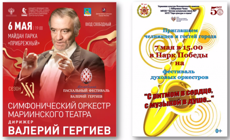 Старт масштабным акциям ко Дню Победы 6 мая даст "КАМАЗ", пригласивший в Челны оркестр Мариинского театра под руководством Валерия Гергиева. Концерт в рамках ХХI Московского Пасхального фестиваля начнется в 19.00 на майдане. На следующий день в парке Победы пройдет фестиваль духовых оркестров.
