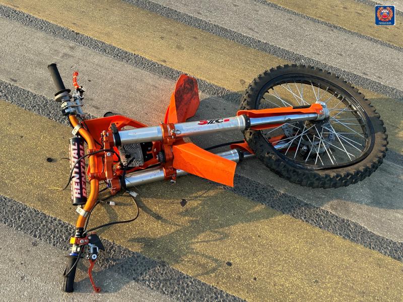 На фотографиях видно, что от удара питбайк разорвало на две части. У автомобиля, столкнувшегося с подростками, тоже заметные повреждения – на переднем крыле и бампере сильные вмятины, разбита правая фара.