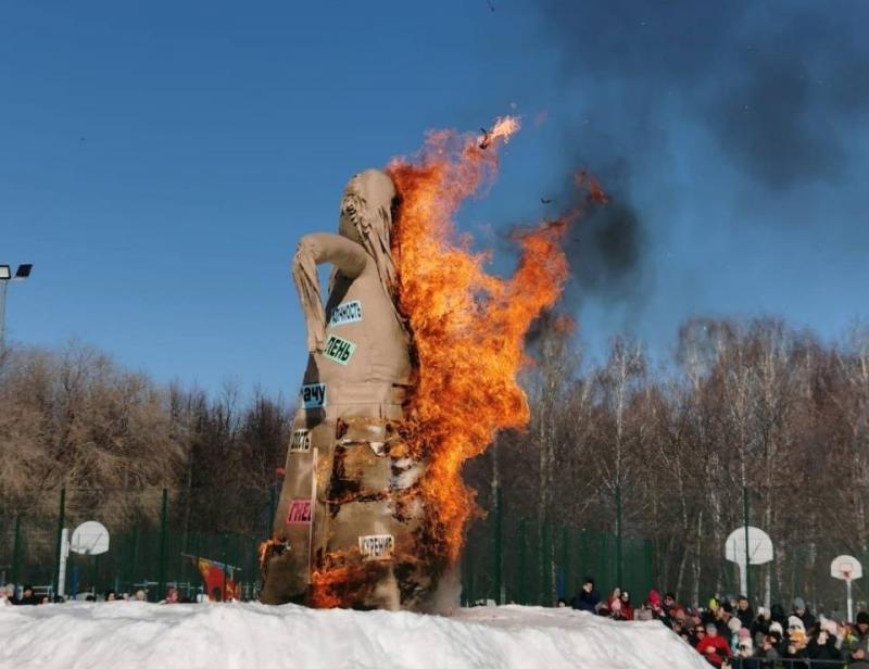 Кульминацией Масленицы стало сжигание чучел, на которых разместили подписи - человеческие пороки: «злость», «лень», «алчность», «курение», «гнев», «уныние».