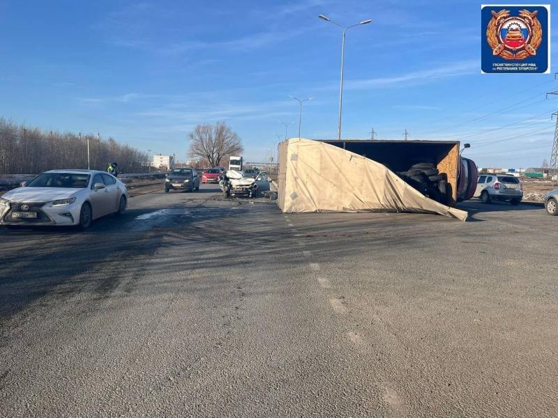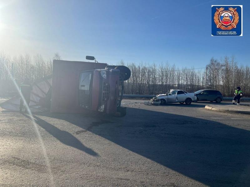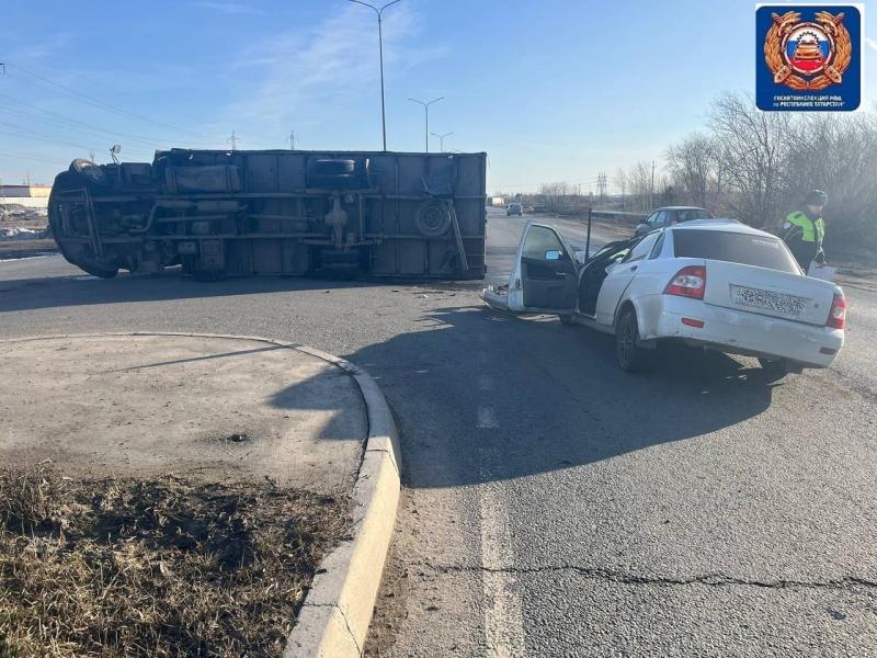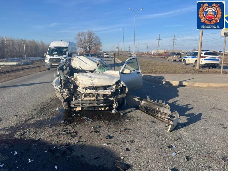 В Набережных Челнах сегодня ранним утром произошло ДТП: на развороте Промышленной улицы легковушка врезалась в «Газель». От столкновения фургон перевернулась на бок, а у легкового автомобиля сильно деформировалась передняя часть.