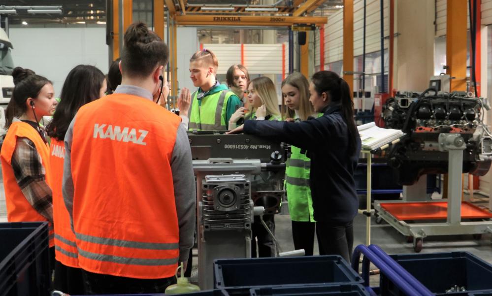 Наблюдать за сборкой автомобилей и мощных агрегатов не менее увлекательно. На «движках» ученикам городских школ показали и конвейер сборки двигателей, и учебно-технологический комплекс, где можно узнать, из чего состоит сердце КАМАЗа, а также изучить содержание кабин большегрузов поколений от К3 до К5, и среднетоннажного «Компаса». Семиклассники старались сделать побольше эффектных фото, а девятиклассники с интересом рассматривали раму, двигатель, мосты. Этим ребятам вскоре предстоит сделать важный выбор, есть над чем задуматься