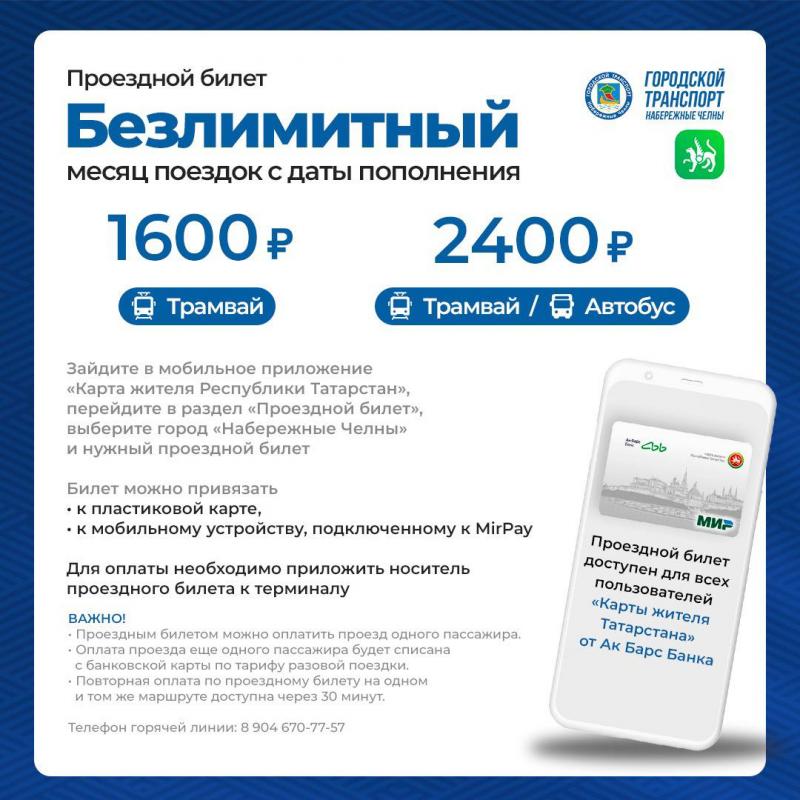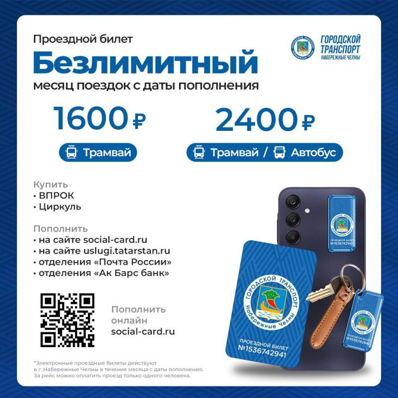 С сегодняшнего дня во всех 85 магазинах сетей «Впрок» и «Циркуль» в Набережных Челнах реализуются проездные билеты на общественный транспорт. Руководитель исполкома города Фарид Салахов заявил сегодня о продаже двух видов проездных – объединенном для автобуса и трамвая по цене 2,4 тыс. рублей, и трамвайном по цене 1,6 тысячи.