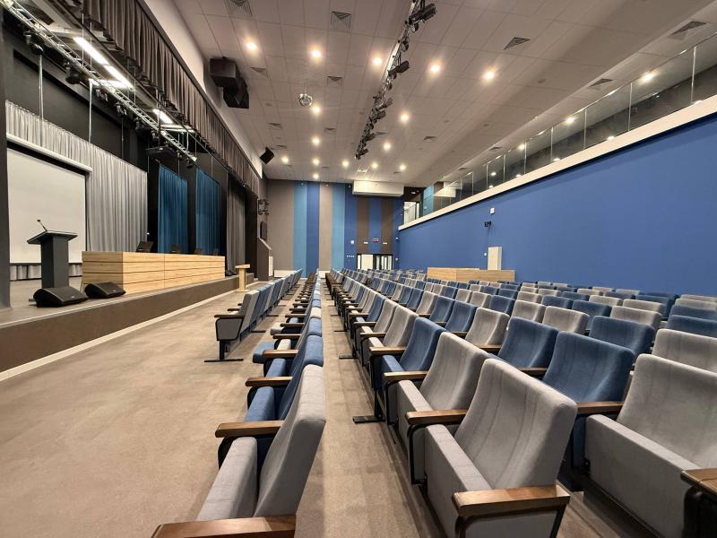 Помимо современных классов, в здании есть лабораторные комплексы для практических занятий, большой спортзал, отдельный легкоатлетический зал и двухэтажный актовый зал.