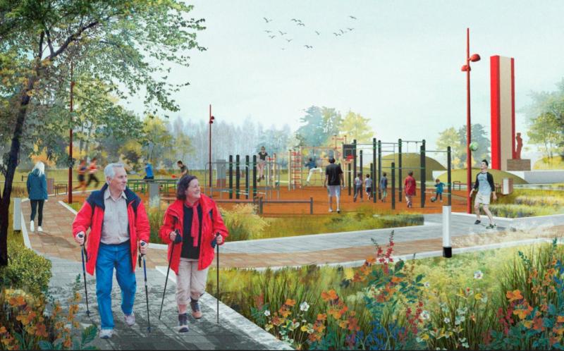 Согласно эскизам, на территории парка после двухэтапной реконструкции появятся: памятник участникам Великой Отечественной войны, спортивная зона, Дом культуры, аллея славы с голубыми елями. Первая очередь предусматривает освоение 6,4 тыс. кв. метров. В нее входят высадка деревьев и цветов, установка скамеек, урна, навигационных стендов, освещения, детской и спортивной площадок.