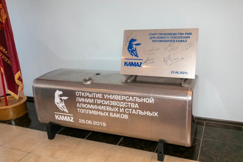 На ПРЗ активно внедряются новые технологии, и отжившие свое безмолвные свидетели торжественных церемоний тоже находят место в музее. Так здесь оказалась зеленая кнопка, с которой запускалась окрасочная линия, первый алюминиевый бак, сваренный в 2019 году, табличка со старта производства рам для нового поколения автомобилей.