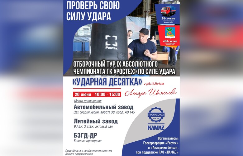 В эту пятницу, 20 июня, на «КАМАЗе» пройдет региональный этап IX абсолютного чемпионата по силе удара — «Ударная десятка – 2025». Соревнования будут проходить в течение одного дня.
