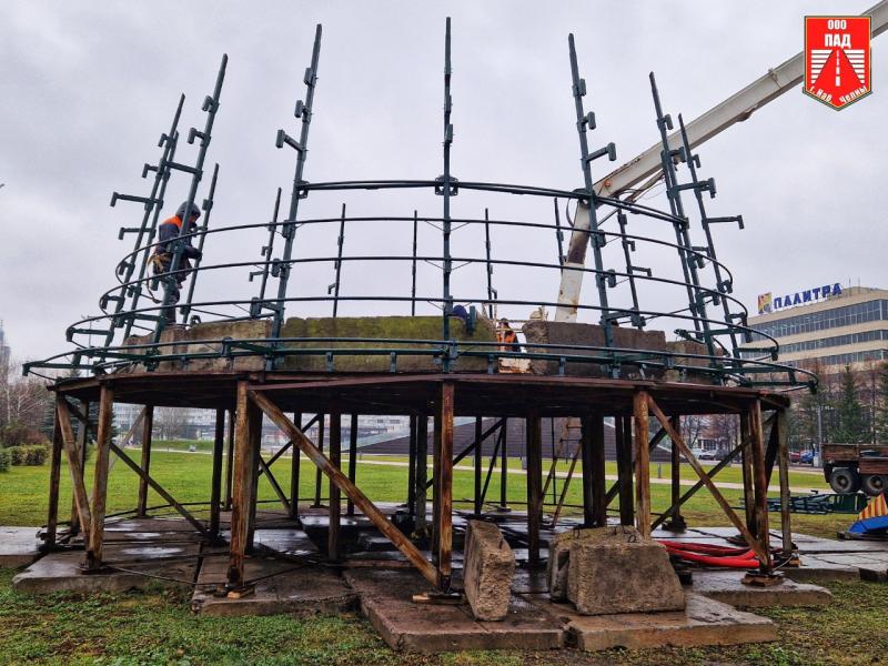 Сегодня специалисты ПАД уже ведут высотные работы: они установили 16 основных стоек, которые формируют ствол будущей ели, и сейчас занимаются монтажом горизонтальных колец. Как только металлический скелет 30-метровой конструкции будет полностью собран, рабочие начнут крепить на него еловые ветки. Финальным этапом станет украшение дерева праздничной иллюминацией.