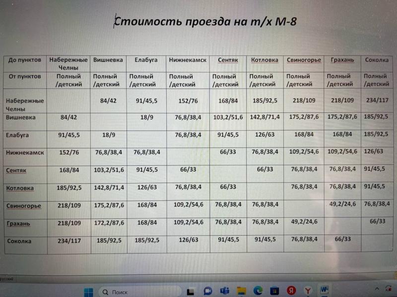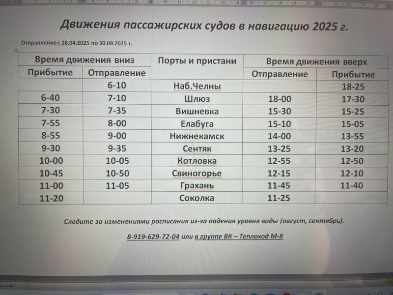 Владельцы теплохода «М-8», который ежегодно в период навигации возит пассажиров из Набережных Челнов до Соколок, опубликовали в своей группе «Вконтакте» расписание и прайс на новый сезон. Согласно расписанию, первый рейс отправится из Челнов 28 апреля в 6.10. На конечную пристань он прибудет в 11.20 и в 11.25 повернет обратно, завершая круг в 18.25.
