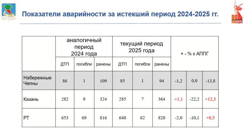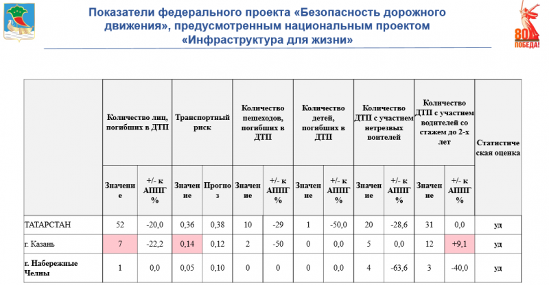 По словам главного госинспектора БДД по Набережным Челнам Радия Кадикова, при таких показателях город отвечает требованиям федерального проекта «Безопасность дорожного движения»: при прогнозном показателе смертности 2 случая за 4 месяца года пока автоград с одним погибшим имеет удовлетворительную оценку. «БДД», напомним, входит в национальный проект «Инфраструктура для жизни», из фонда которого Набережные Челны получают средства на ремонт дорог. В этом году, к примеру, по нацпроекту профинансировано продолжение капремонта проспекта Яшьлек. Кроме того, в контур «Инфраструктуры для жизни» входит обновление региональных пассажирских автопарков.