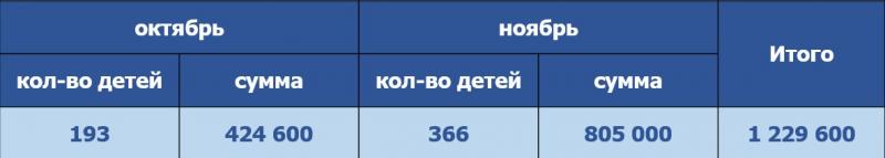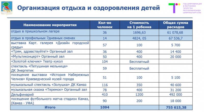 Помимо отраженных в таблице мероприятий дети смогли посмотреть постановку театра кукол «Маугли» на сцене татдрама – для них были приобретены 278 билетов на 69,5 тыс. рублей; им переданы 110 разовых абонементов в бассейны, а также город организовал футбольный фестиваль «Кубок Единства», прошедший с 31 октября по 4 ноября. 38 команд, включая группы из Севастополя, Луганска и Донецка, провели сотню матчей, а футболисты ДНР и ЛНР получили от города спортивные костюмы и мячи.