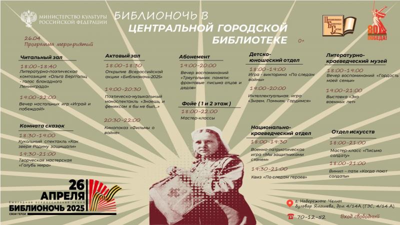 В этом году «Библионочь» посвящена 80-летию Великой Победы. Тема акции – «Свои герои», девиз звучит как «Нет в России семьи такой, где бы не памятен был свой герой». Программу мероприятий на этот вечер опубликовала мэрия автограда.
