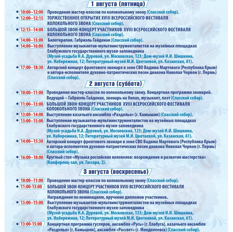 С 1 по 3 августа в Елабуге пройдет XVIII Всероссийский фестиваль колокольного звона. Концерты пройдут на колокольне и площади Спасского собора, сообщает Елабужский государственный музей-заповедник.