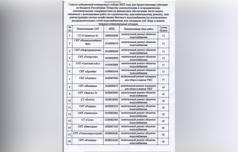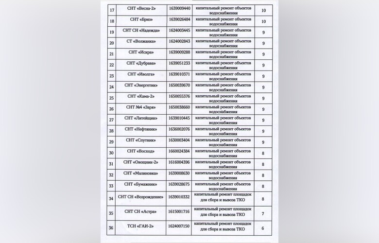 Несколько садоводческих некоммерческих товариществ Набережных Челнов и Тукаевского района вошли в список победителей конкурса на строительство и ремонт сетей водоснабжения, а также контейнерных площадок для сбора твердых коммунальных отходов.