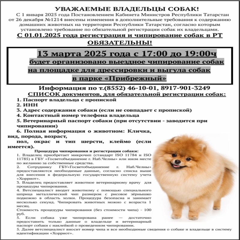 Специалисты ГБУ «Госветобъединение Набережных Челнов» сегодня проведут выездное чипирование собак. Ветеринары будут ждать хозяев на площадке для выгула и дрессировки собак в парке «Прибрежный» с 17:00 до 19:00.