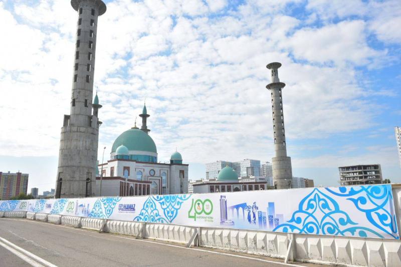 Ограждение строительной площадки соборной мечети «Джамиг» стало местом демонстрации эмблем, разработанных к грядущим в следующем году юбилеям города Набережные Челны и первого грузовика КАМАЗ. Забор стройки сегодня обтянут баннерами с праздничной символикой.