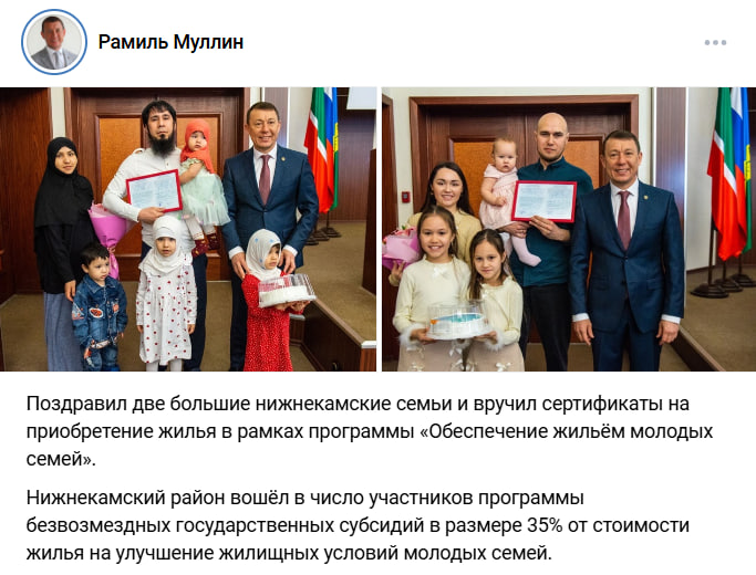 Причиной волнений стал пост, который 3 марта опубликовал глава Нижнекамского района Рамиль Муллин. Он лично поздравил две семьи с получением жилищных сертификатов, которые означают субсидию на покупку жилья в размере 35%. Поддержку по госпрограмме получили Холзода и Тоирова, воспитывающие четверых детей, а также Регина и Дмитрий Лихиновы, у которых трое детей.