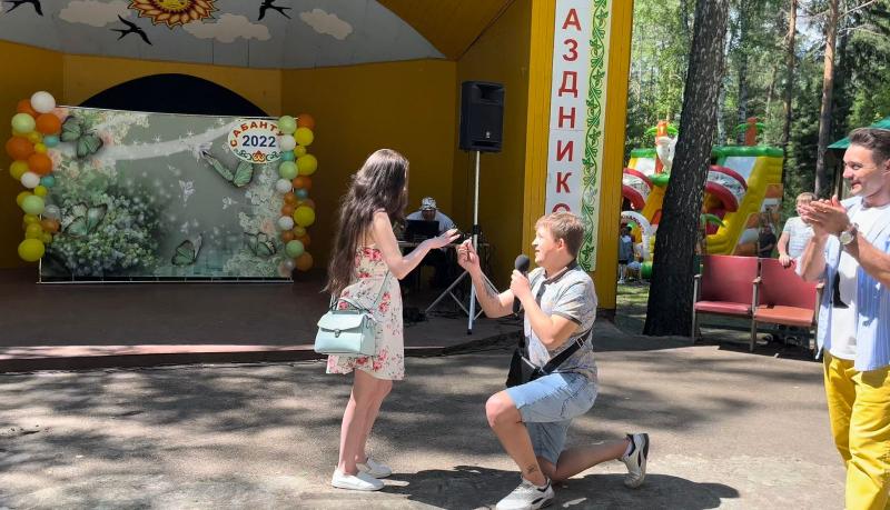 Работник цеха изготовления оснастки Нияз Ризванов приехал на Сабантуй вместе со своей девушкой Динарой. Молодые люди встречаются уже год, и Нияз решил, что настало время стать семьей. А для начала надо спросить любимую, согласна ли она. И молодой человек придумал смелый способ заявить о своей любви: сделать предложение руки и сердца при всем честном народе, на глазах у своих коллег. Он поделился идеей с организаторами и ведущими праздника, а те с радостью согласились помочь парню.