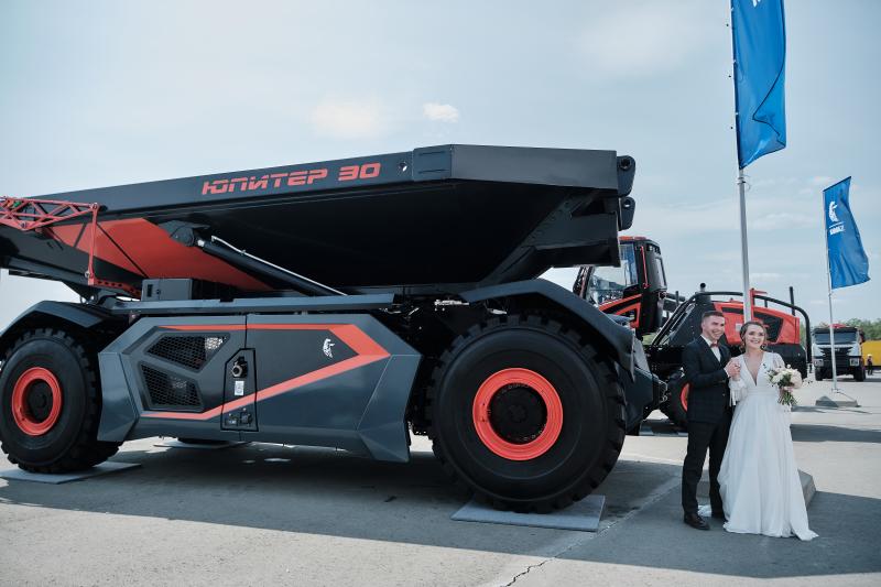 Необычный фон поставил в тупик и фотографа, поскольку подобрать ракурс для съемки крупным планом на фоне огромных машин оказалось непросто. Помогли первые посетители выставки, которые и сами решили поснимать Фараносовых в свадебном облачении – себе на память.