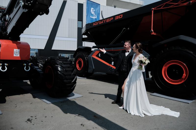 Работники и работницы "КАМАЗа", которые решат связать свои судьбы узами брака, могут претендовать на уникальную свадебную фотосессию. Испытателями нового формата праздничной съемки стали Семен и Мария Фараносовы: их семейный альбом теперь открывается фотографиями на фоне опытных образцов техники, собранной в Набережных Челнах.