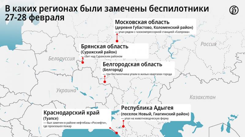 - За минувшие сутки, начиная с ночи на 28 февраля, в разных регионах России были зафиксированы атаки беспилотников.