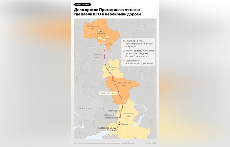 - В пятницу основатель ЧВК «Вагнер» Евгений Пригожин сделал несколько нелицеприятных заявлений в адрес руководства минобороны, в том числе сообщил о якобы нанесенным российскими войсками по тылам ЧВК ракетном ударе. Минобороны отреагировало публичным опровержением этой информации, назвав ее провокацией со стороны Пригожина, однако последний к вечеру потребовал выдачи ЧВК министра обороны РФ Сергея Шойгу и начальника генштаба ВС РФ Валерия Герасимова, а также объявил «марш справедливости» на Москву. Штаб «Вагнера» обосновался в Ростове-на-Дону, откуда утром 24 июня подразделения ЧВК вышли колонной в сторону столицы по трассе М-4. В Москве и нескольких регионах был объявлен режим контртеррористической операции.