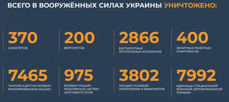 - В ДНР сбиты три самолета Су-25 Воздушных сил Украины, уничтожены четыре самоходные артустановки Krab польского производства и две радиолокационные станции контрбатарейной борьбы AN/TPQ-50 и AN/TPQ-36. В районе Артемовска и Константиновки разбиты две установки РСЗО «Град»
