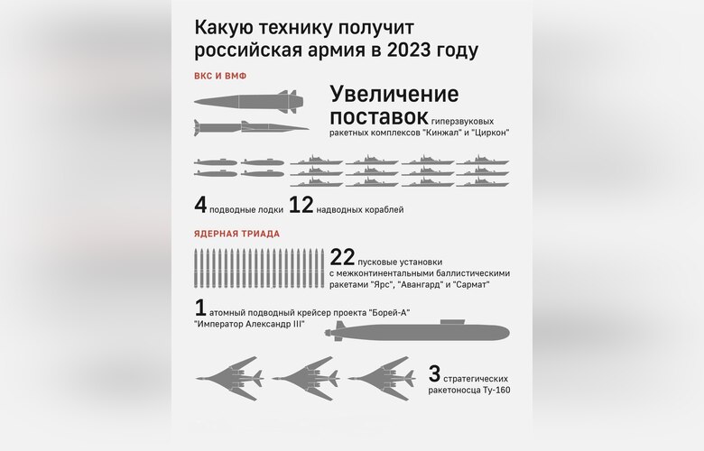 - Как заявил министр обороны РФ Сергей Шойгу, в 2023 году в ВС РФ появится новая военная техника: 22 пусковые установки с межконтинентальными баллистическими ракетами «Ярс», «Авангард» и «Сармат», 3 стратегических ракетоносца Ту-160, атомный подводный крейсер «Император Александр III». Также армия получит 4 подводные лодки и 12 кораблей, планируется нарастить поставки высокоточных гиперзвуковых ракетных комплексов «Кинжал» и «Циркон». Работа над другими перспективными образцами продолжится.