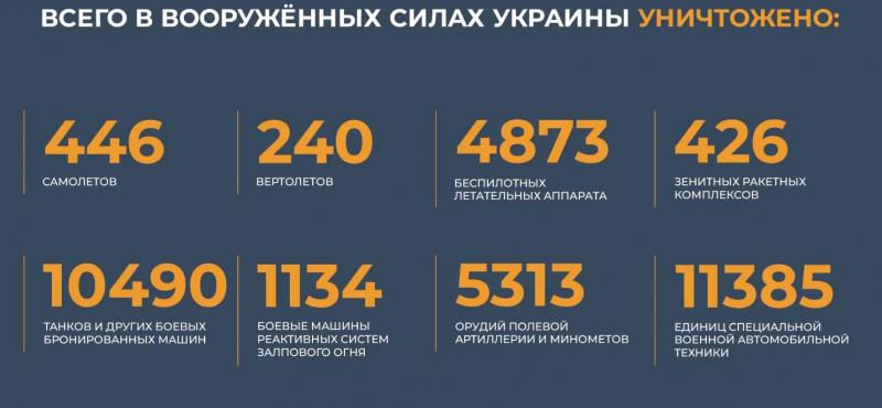 - Украинские войска за месяц с 4 июня на всех направлениях лишились около 2,5 тыс. единиц различного вооружения, заявил министр обороны РФ Сергей Шойгу. Только на южнодонецком, запорожском и донецком направлениях, где ВСУ предпринимают безуспешные атаки, уничтожены 15 самолетов, 3 вертолета, 920 единиц бронетехники, в том числе 16 танков Leopard. По словам министра, ни на одном из направлений ВСУ своих целей не достигли