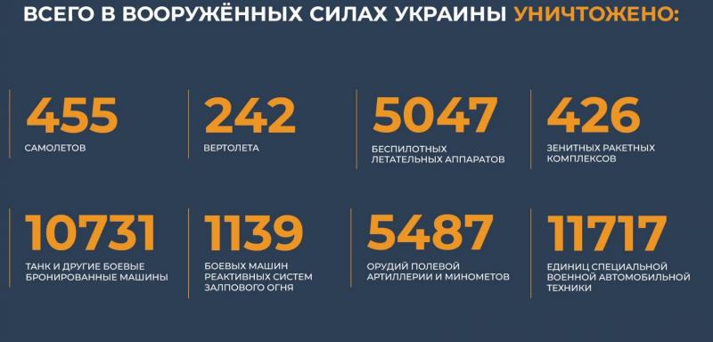 - Уничтожен склад топлива для военной техники оперативно-тактической группы "Лиман" в районе Краматорска в ДНР, склады боеприпасов ВСУ в районе Малой Токмачки Запорожской области, а также возле Новоегоровки в ЛНР, Краматорска и Водяного в ДНР