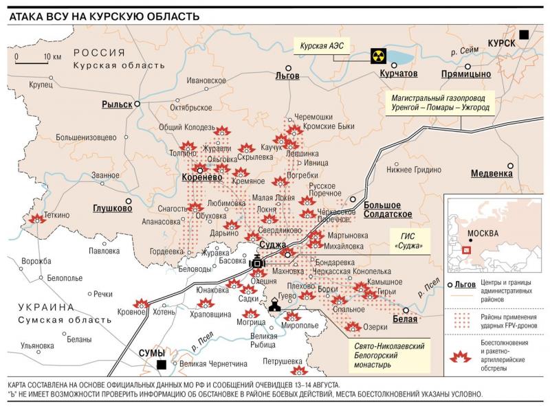 Замначальника военно-политического управления минобороны Апти Алаудинов заявил, что ВСУ планировали в результате прорыва еще 11 августа взять Курскую АЭС в Курчатове. После этого Украина планировала собиралась России ультиматум. Сейчас, по словам Алаудинова, российские военные закрывают блокаду ВСУ в регионе, ситуация контролируется вооруженными силами РФ