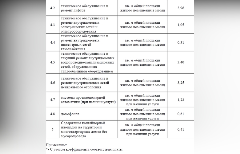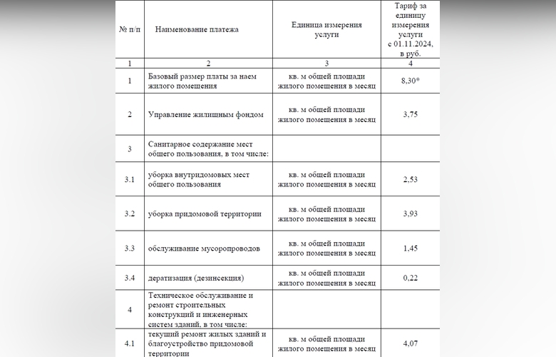 С 31 октября прошлого года, когда были утверждены тарифы, действовавшие до сих пор, на прежнем уровне остались цены за обслуживание мусоропроводов (1,45 рубля), а также за техобслуживание и ремонт газовых сетей (0,31 рубля). Обслуживание домофонов подорожало несколько раньше - в начале осени (0,61 рубля). Таким образом, изменения коснулись десяти позиций, самой существенной из которых оказалась уборка придомовой территории – очистка дворов от снега и мусора стала дороже на 43 копейки за квадратный метр, прежде эта работа оценивалась в 3,5 рубля. Услуга дератизации и дезинсекции подъездов, напротив, подешевела практически на рубль (22 копейки вместо 1,21 рубля).