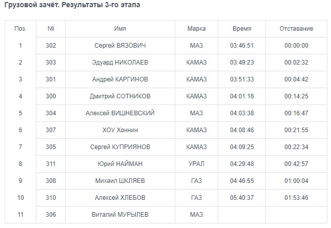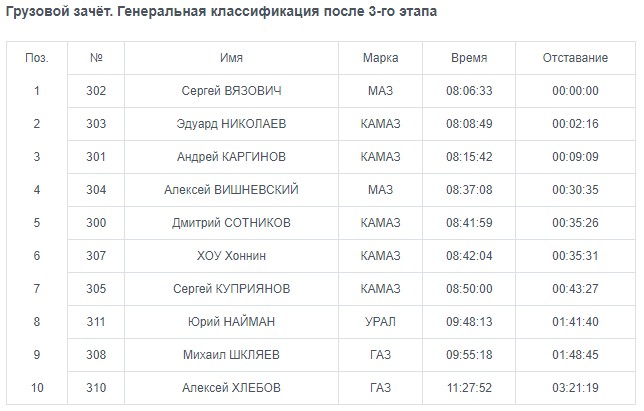Экипаж Сергея Вязовича на белорусском МАЗе выиграл третий этап ралли «Шелковый путь-2023» и в генеральном зачете получил преимущество в 2 минуты 16 секунд перед экипажем Эдуарда Николаева на капотном КАМАЗе. Третьим, с отставанием еще почти в 7 минут, идет второй грузовик "КАМАЗ-мастера" под управлением Андрея Каргинова. Первые семь позиций генеральной таблицы занимают гонщики из Минска и Набережных Челнов.