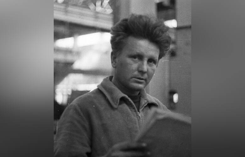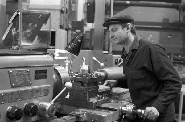 Борисов Виктор Андреевич – токарь ЦМА за работой на первом станке РИЗа.