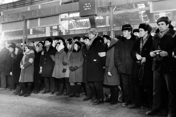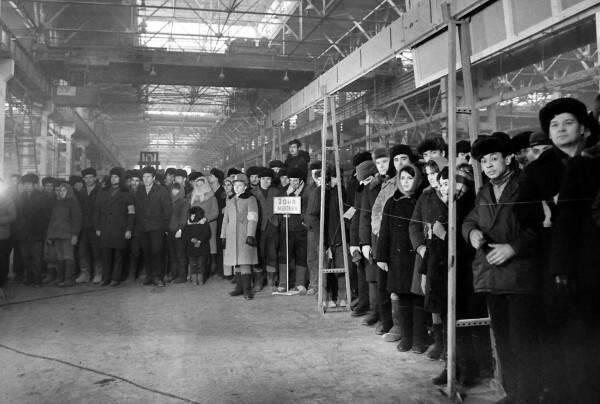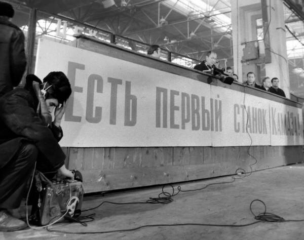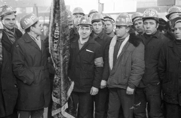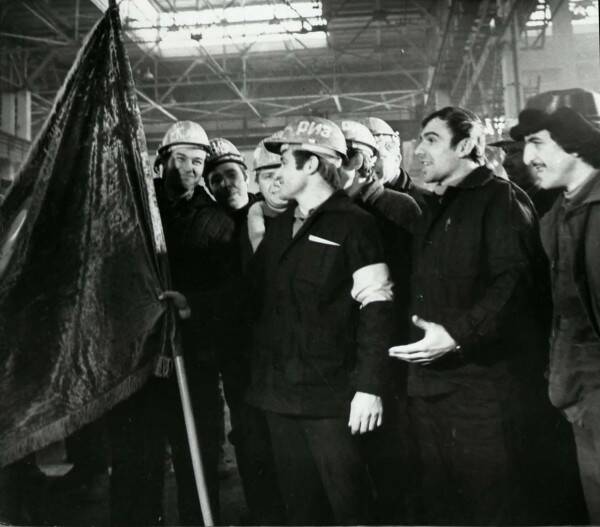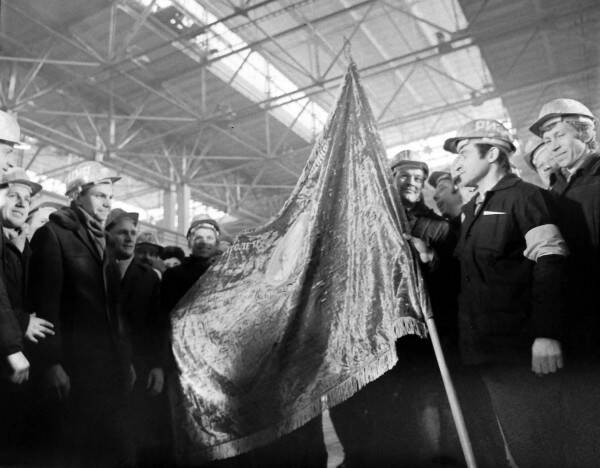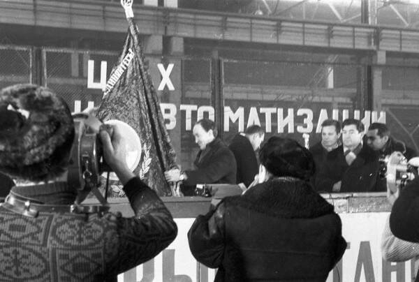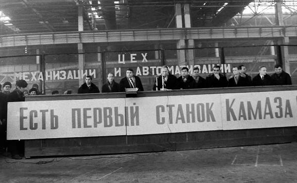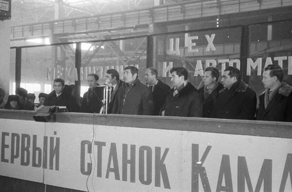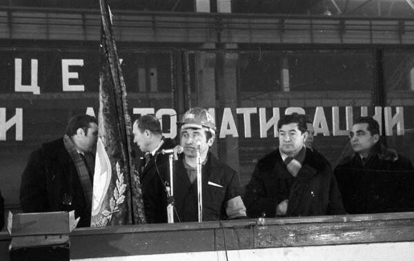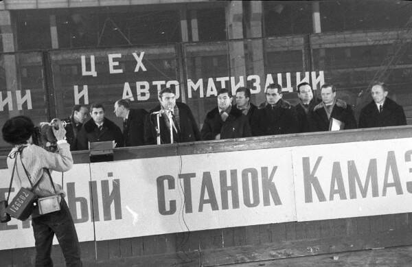 Во время митинга Бочкарёв Борис Дмитриевич- секретарь комитета ВЛКСМ РИЗа вручил переходящее Красного знамени комитета ВЛКСМ КАМАЗа бригаде Акиньшина Анатолия Сергеевича, как победителю социалистического соревнования за право монтажа первого станка