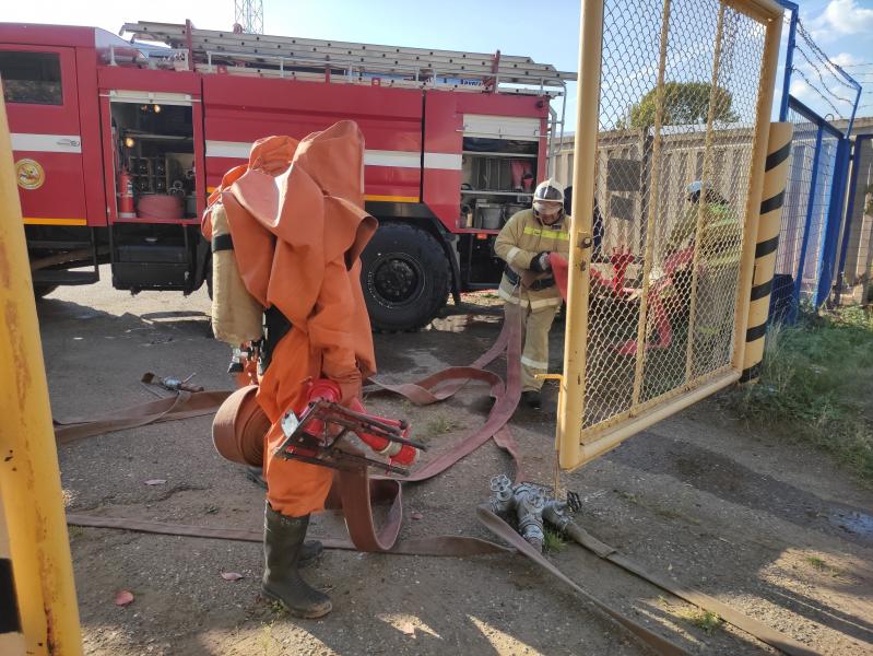 Локацией очередных антитеррористических учений на "КАМАЗе" стал склад кислот и щелочей логистического центра. Здесь, согласно легенде тренировки, беспилотник сбросил взрывное устройство, в результате чего начался пожар и пробоину получила автоцистерна с натром едким.