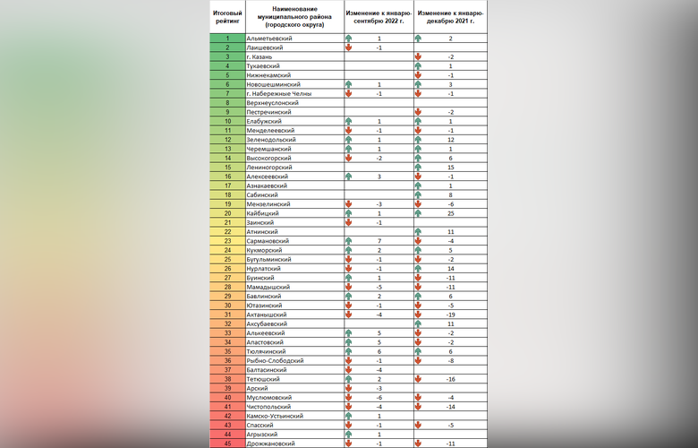 Возглавляет рейтинг нефтяная столица Татарстана Альметьевск, а сентябрьский лидер Лаишевский район спустился на вторую строку. Казань – на третьем месте, аутсайдером выступает Дрожжановский район.