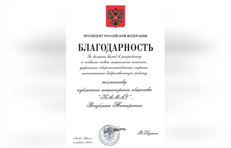 За большой вклад в разработку и создание новой специальной техники, укрепление обороноспособности страны, многолетнюю добросовестную работу коллективу ПАО «КАМАЗ» объявлена Благодарность Президента Российской Федерации Владимира Путина.