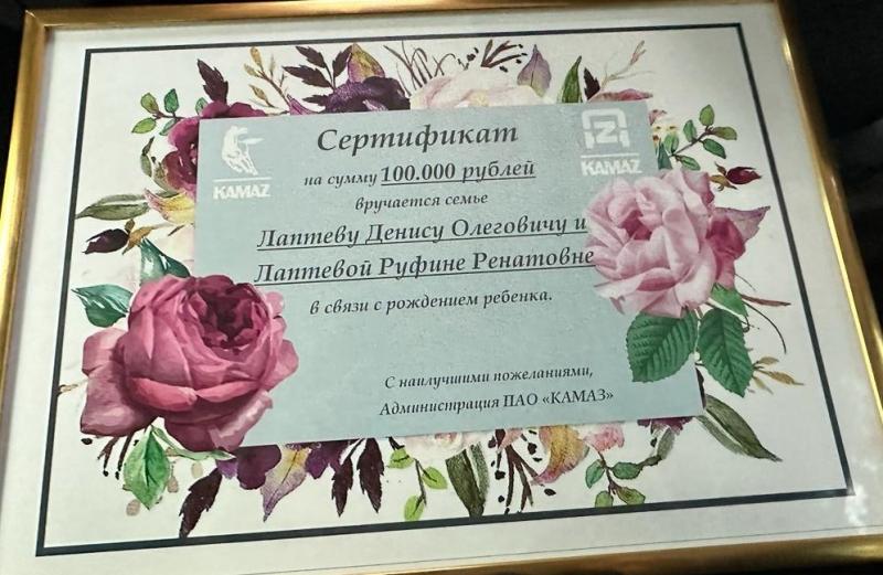 Заместитель гендиректора ПАО «КАМАЗ» по безопасности Сирень Галиакберов от имени генерального директора Сергея Когогина передал родителям подарки и денежный сертификат на 100 тыс. рублей, который они смогут потратить на нужды малышки.