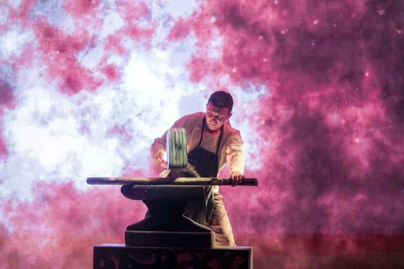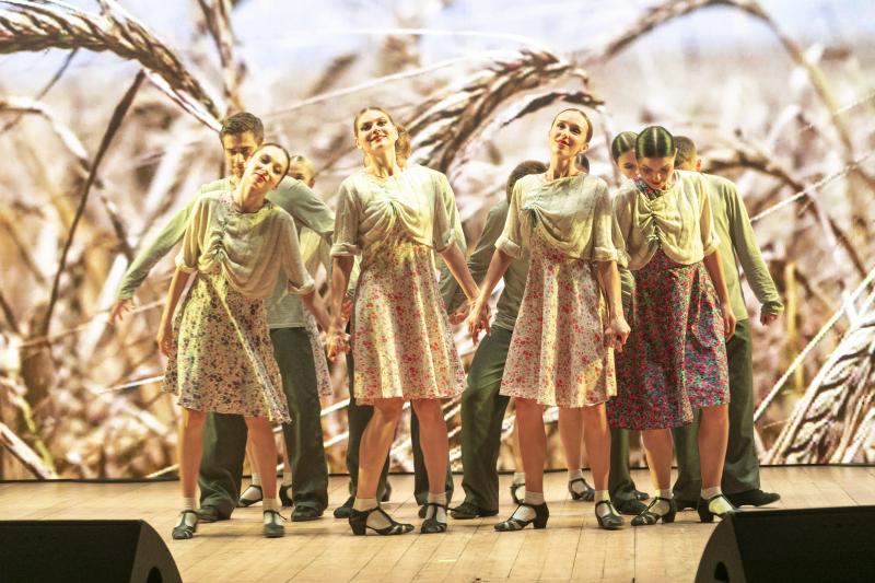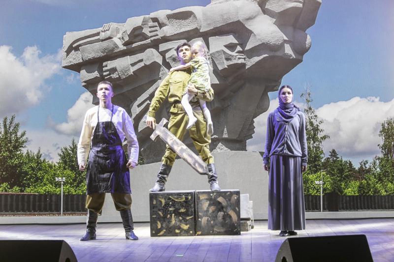 В формате театрализованного представления зрителю представили хореографические слепки с известнейших мемориалов, посвященных Великой Отечественной – магнитогорского «Тыл - фронту», волгоградского «Родина-мать зовет!» и берлинского «Воин-освободитель». Три символа артистам удалось объединить в единую концепцию: сначала кузнец «выковал» на сцене меч Победы и передал его воину. Затем Родина-мать поднимает меч в призыве к битве и передает его сыновьям – из рук в руки, от фронта к фронту. В руке воина-освободителя, одновременно держащего у груди девочку, оружие склоняется острием вниз в знак окончания войны. Завершается перфоманс минутой молчания.