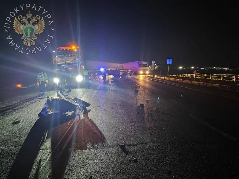 Грузовик Volvo с полуприцепом и «ВАЗ 2114» столкнулись в минувшую субботу около 18:40. По данным Госавтоинспекции, водитель легкового автомобиля не справился с управлением и въехал в фуру, которая выполняла разворот. При этом по данным прокуратуры РТ, 39-летний водитель грузовика при маневре не уступил дорогу встречному транспорту.