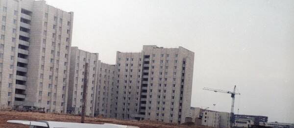Внизу дома 23/07Б, 23/07В, 23/07Г, 23/07Д, облицованные плиткой производства ЗЯБ. 1989 год.