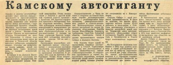 Хранятся в Музее КАМАЗа вырезки газетных публикаций на тему «КАМАЗ строит вся страна».