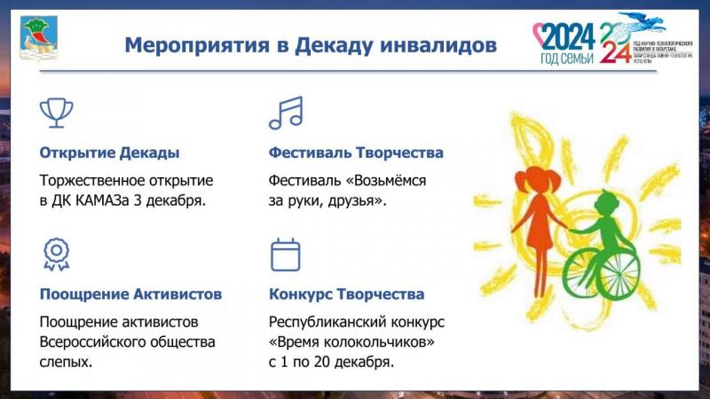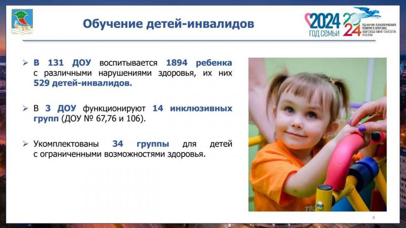 В преддверии декады инвалидов Харисов рассказал о состоянии инклюзивной среды в городе. По его словам, сейчас в трех детских садах города работают 14 инклюзивных групп, а всего в Челнах воспитываются 1,9 тыс. дошкольников с разными нарушениями здоровья, инвалидами из них числятся 529 детей. Специализированные группы для детей с ОВЗ открываются в автограде ежегодно. Для этого в помещениях устанавливаются лифты, оборудованные санузлы, стенды светового и звукового оповещения.