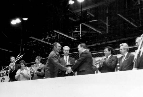 Батищев Яков Петрович – наладчик завода двигателей передаёт представителю автомобильного завода паспорт на юбилейное изделие.