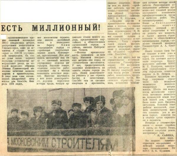Стоит сказать, что за 1971-1977 годы Главмосстрой построил в Набережных Челнах 116 жилых домов, среди которых были 12-ти и 16-тиэтажные. Московскими строителями было освоено 8 новых серий жилых домов улучшенной планировки.