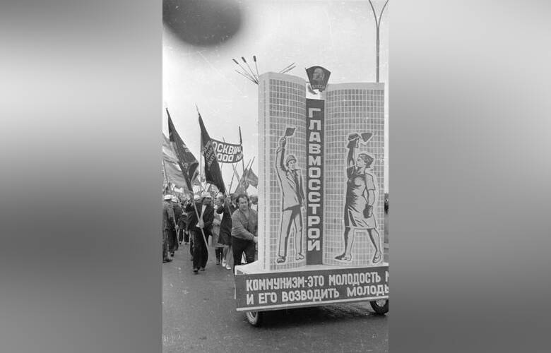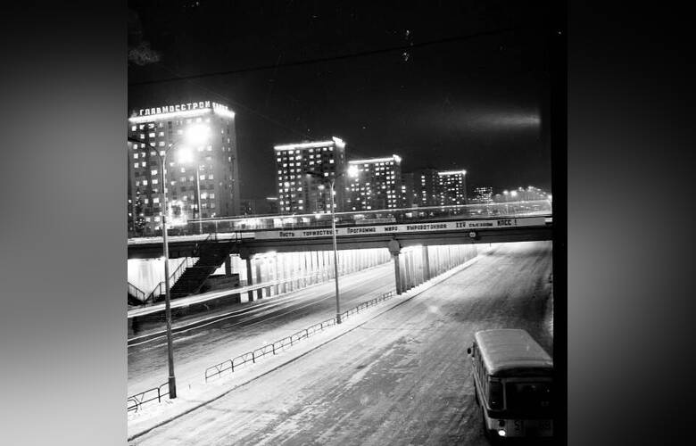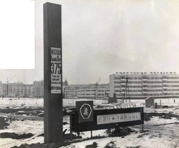 Долгое время на проспекте 50-летия СССР на самом видном месте стояла вот такая конструкция Главмосстроя с портретами передовиков московской организации.
